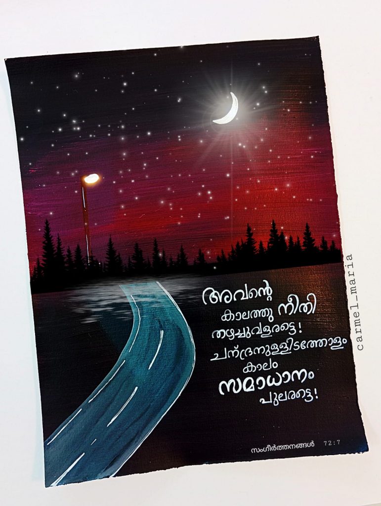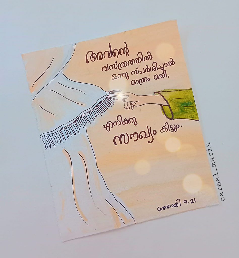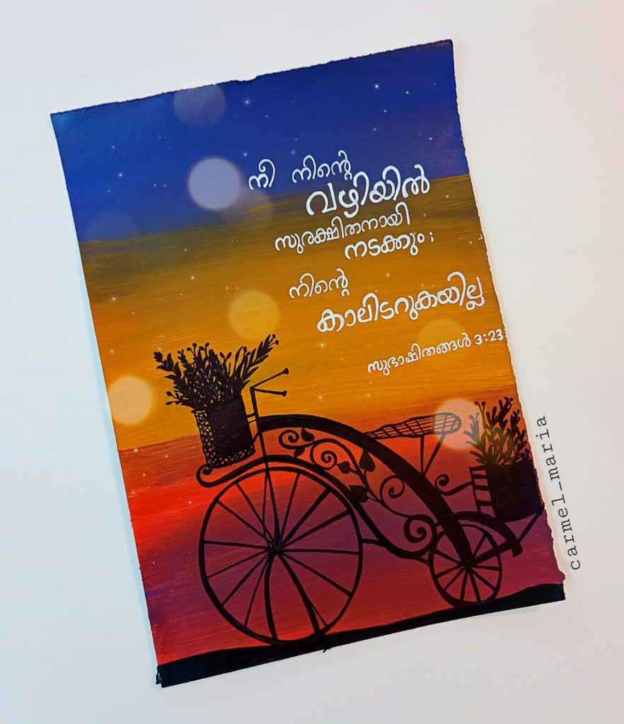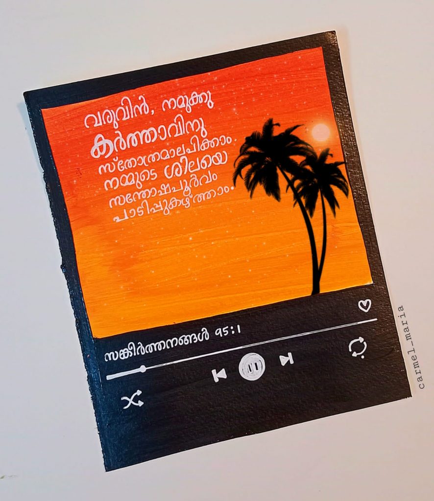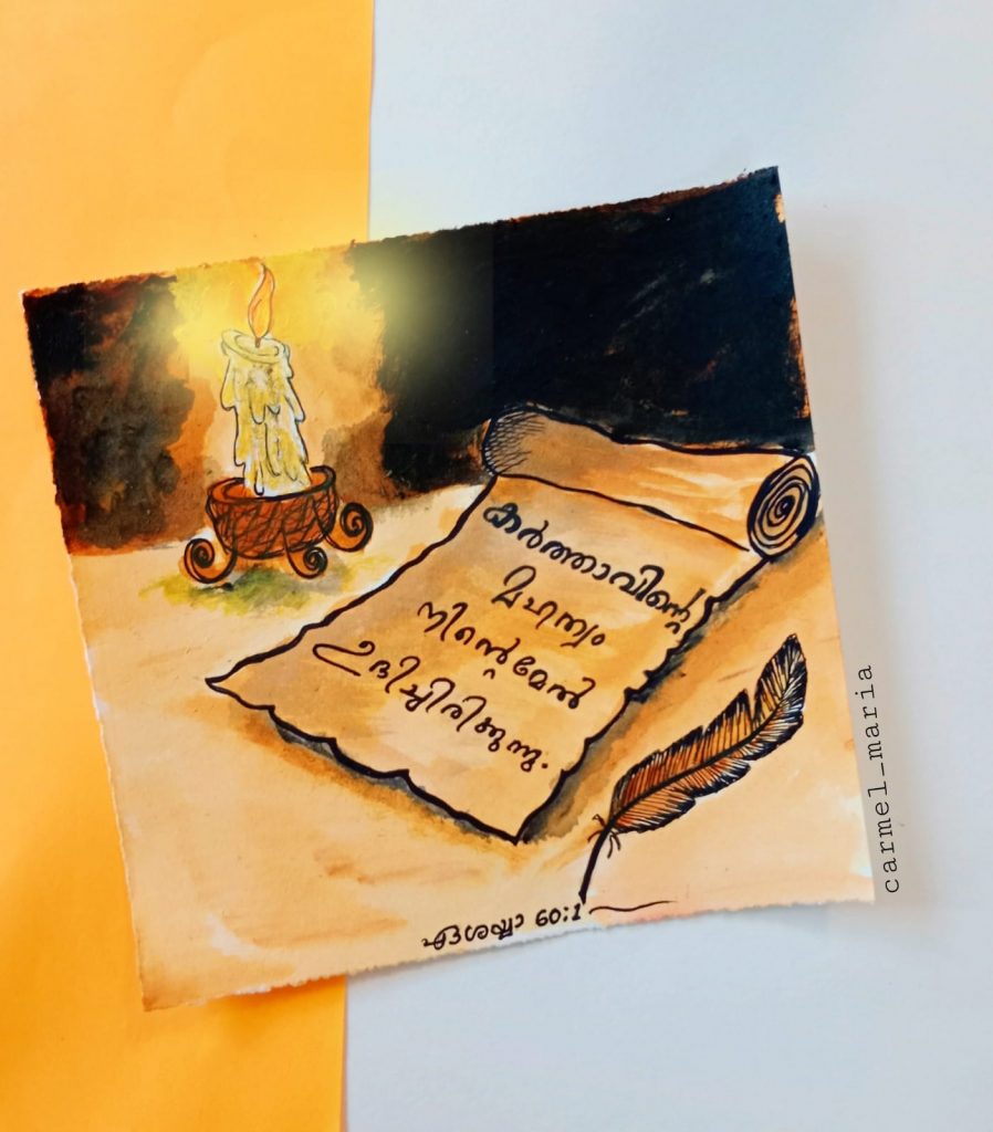 വിശുദ്ധ ഗ്രന്ഥത്തിലെ വചനങ്ങള് വേറിട്ട രീതിയില് നിരവധി ആളുകളിലേക്ക് എത്തിച്ചുകൊണ്ട് ശ്രദ്ധ നേടുകയാണ് ഈ മിടുക്കി. ചിത്രരചനയില് തല്പ്പരയായ കാര്മല് ബൈബിള് വചനങ്ങള് തന്റെ ഭാവനയോടൊപ്പം ചേര്ത്ത് അനേകരിലേക്ക് എത്തിക്കുകയാണ്. രാവിലെ ഉണരുമ്പോള് മൊബൈല്ഫോണ് നോക്കുന്ന പലരും ഇപ്പോള് കാര്മ്മല് വരച്ച ചെറിയ ചിത്രങ്ങളിലെ വലിയ ആശയങ്ങള് ഗ്രഹിച്ച് വചനം മനസ്സില് നിറച്ച് ദിവസം ആരംഭിക്കുന്നുണ്ട്.