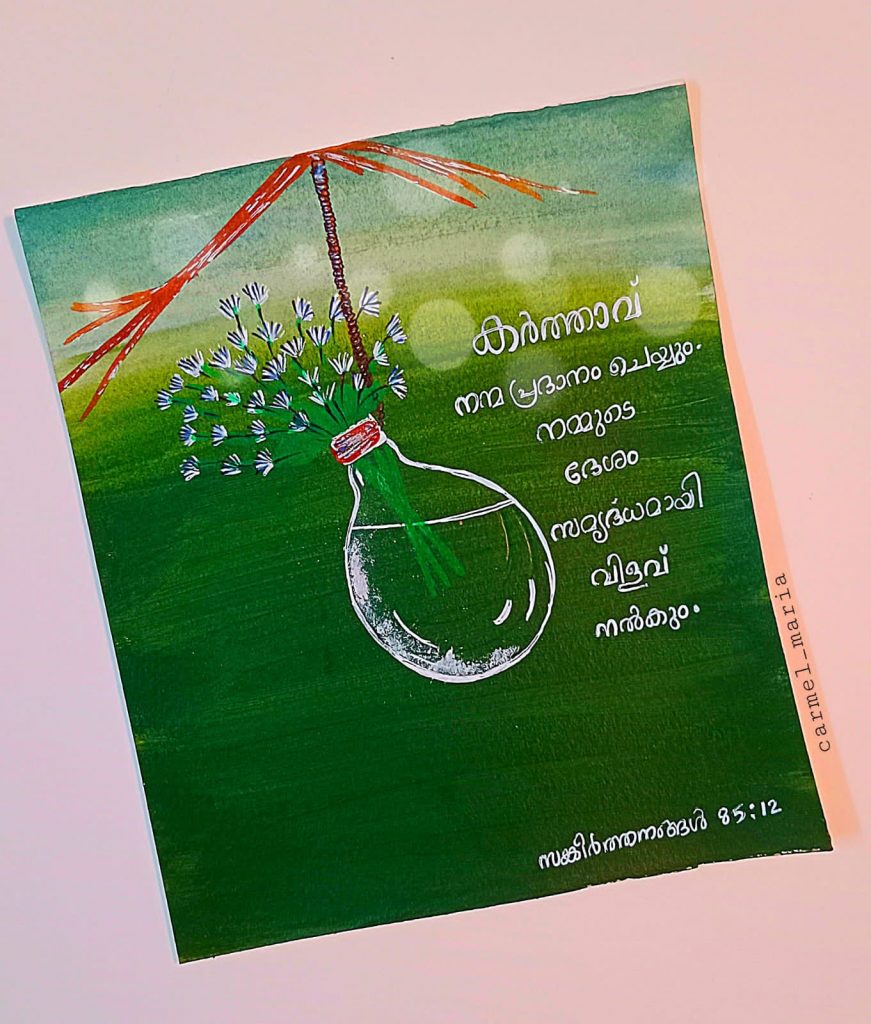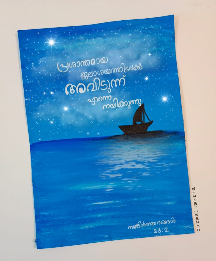 ഇപ്പോള് തന്റെ കഴിവുകള് മെച്ചപ്പെടുത്തി കൂടുതല് മനോഹരമായ സൃഷ്ടികള് സംഭാവന ചെയ്ത് ഈശോയ്ക്കായി വചനങ്ങള് പങ്കുവയ്ക്കാന് ഉള്ള പുതിയ വഴികളിലാണ് കാര്മല്. നമ്മുടെ കഴിവുകളും ചിന്തകളും കര്ത്താവിനുവേണ്ടി പ്രയോജനപ്പെടുത്തുമ്പോള് നാം പോലും അറിയാതെ നമ്മുടെ ലക്ഷ്യങ്ങളിലേക്ക് അവിടുന്ന് നമ്മെ നയിക്കും.