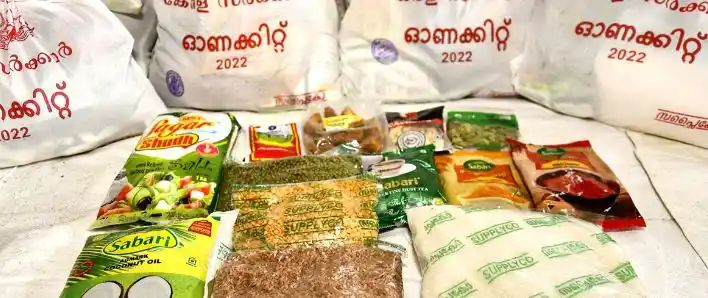തുണി സഞ്ചി ഉള്പ്പടെ 14 ഇനങ്ങളുള്ള ഭക്ഷ്യ കിറ്റാണ് വിതരണം ചെയ്യുന്നത്. ഇത്തവണ പപ്പടത്തിനും ശര്ക്കരയ്ക്കും പകരം മില്മ നെയ്യും ക്യാഷു കോര്പ്പറേഷനിലെ കശുവണ്ടി പരിപ്പും കിറ്റില് ഉള്പ്പെടുത്തിയിട്ടുണ്ട്.ആഗസ്റ്റ് 23,24 തീയതികളില് മഞ്ഞ കാര്ഡുടമകള്ക്കും ആഗസ്റ്റ് 25, 26, 27 തീയതികളില് പിങ്ക് കാര്ഡുടമകള്ക്കും ആഗസ്റ്റ് 29, 30, 31 തിയതികളില് നീല കാര്ഡ് ഉളളവര്ക്കും സെപ്തംബര് 1, 2, 3 തിയതികളില് വെള്ള കാര്ഡുടമകള്ക്കുമാണ് സൗജന്യ ഭക്ഷ്യ കിറ്റുകള് വിതരണം ചെയ്യുന്നത്. ഏതെങ്കിലും കാരണങ്ങളാല് ഈ ദിവസങ്ങളില് ഓണക്കിറ്റ് വാങ്ങാന് കഴിയാത്തവര്ക്ക് സെപ്റ്റംബര് 4, 5, 6,7 തിയതികളില് കിറ്റ് വാങ്ങാവുന്നതാണ്. ഓണത്തിന് ശേഷം കിറ്റ് വിതരണം ഉണ്ടാവില്ല.