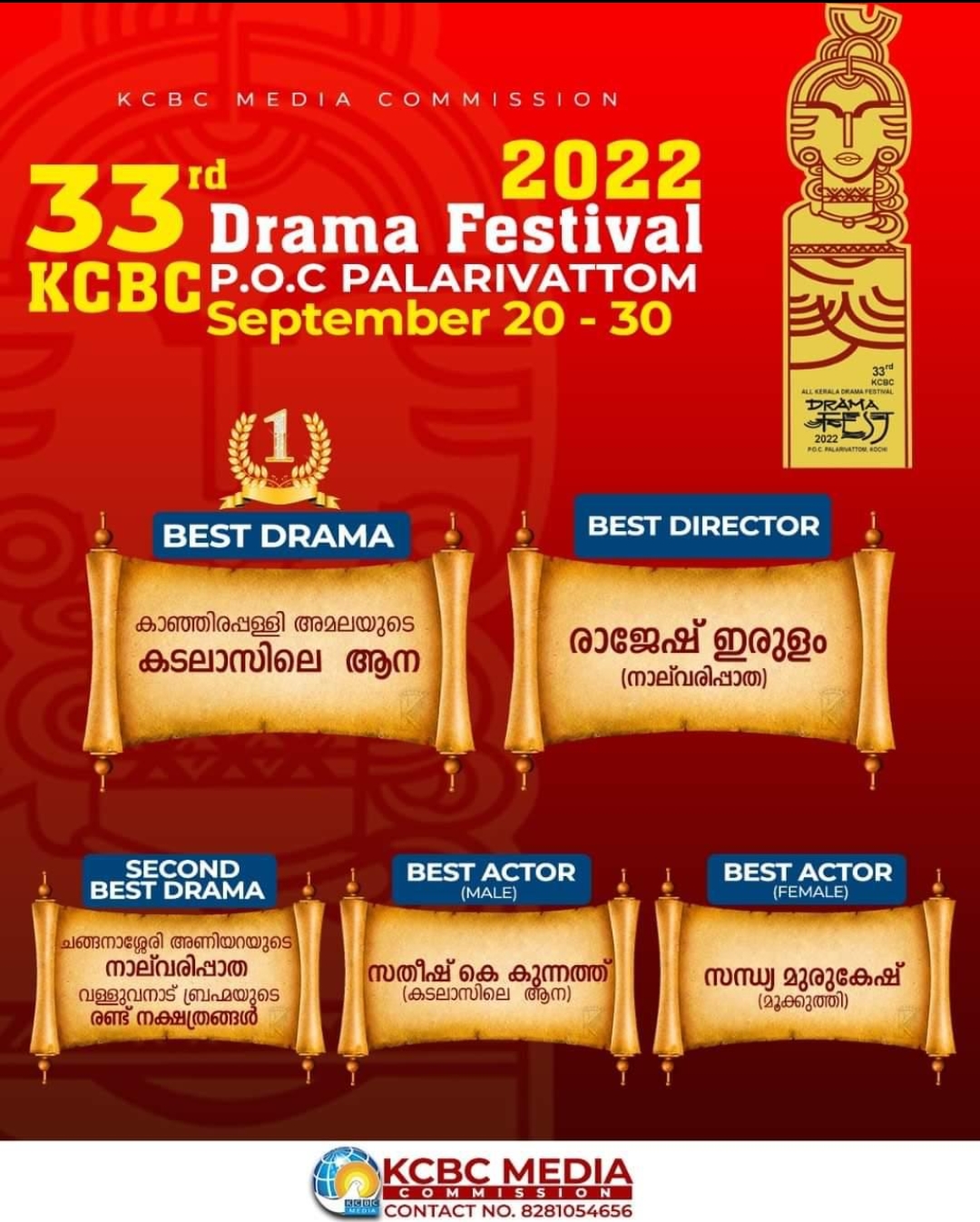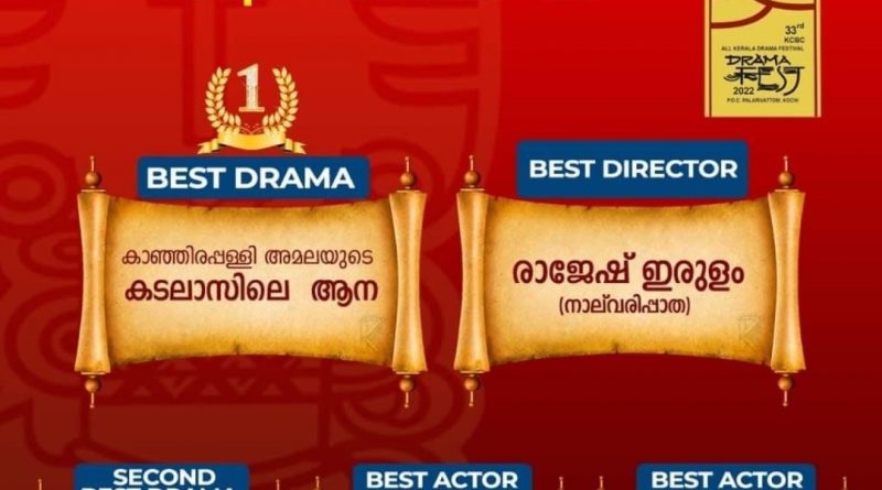 33ആം കെസിബിസി നാടക മേളയുടെ അവാർഡുകൾ പ്രഖ്യാപിച്ചു.സെപ്റ്റംബർ 20 മുതൽ 29വരെ പി ഒ സി യിൽ നടന്ന നാടക മേളയുടെ ഫലം പ്രഖ്യാപിച്ചു.