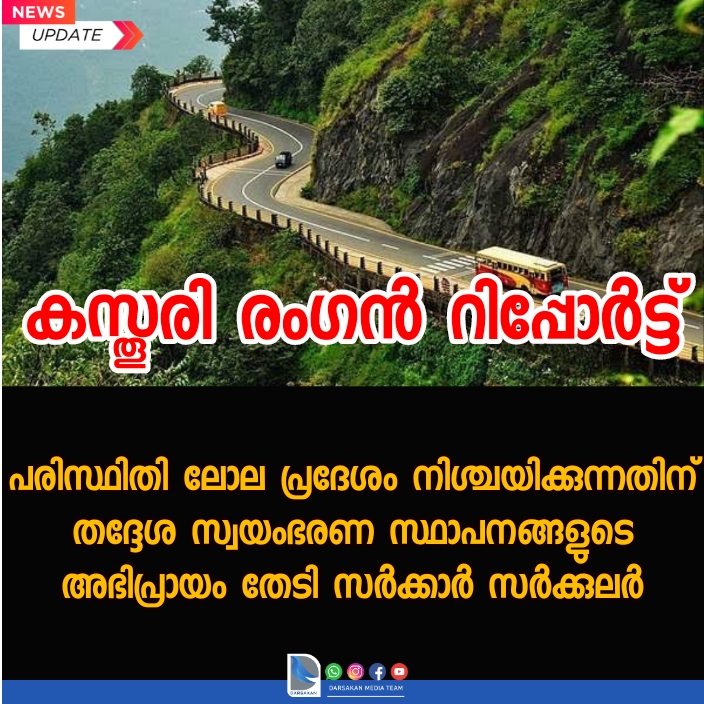 കസ്തൂരി രംഗൻ റിപ്പോർട്ടിന്റെ അടിസ്ഥാനത്തില് പശ്ചിമഘട്ട പരിസ്ഥിതി ലോല പ്രദേശം നിശ്ചയിക്കുന്നതിന് തദ്ദേശ സ്വയംഭരണ സ്ഥാപനങ്ങളുടെ അഭിപ്രായം തേടി സർക്കാർ സർക്കുലർ അയച്ചു.