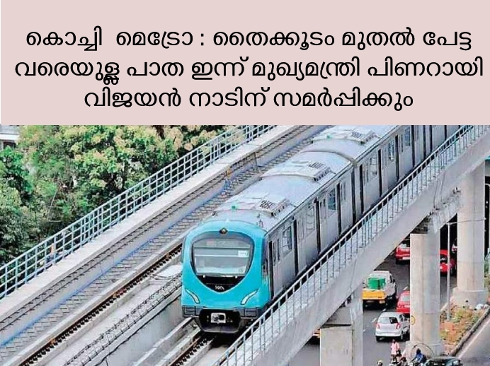 കൊച്ചി മെട്രോ ഇന്ന് മുതല് പേട്ടയിലേക്ക് ഓടിത്തുടങ്ങും. തൈക്കൂടം മുതല് പേട്ട വരെയുള്ള പാത ഇന്ന് മുഖ്യമന്ത്രി പിണറായി വിജയന് നാടിന് സമര്പ്പിക്കും. കേന്ദ്രമന്ത്രി ഹര്ദീപ് സിംഗ് പുരി ഓണ്ലൈനിലൂടെ ചടങ്ങിന് അധ്യക്ഷത വഹിക്കും. ഇരുവരും ചേര്ന്നാകും ആദ്യ സര്വീസ് ഫഌഗ് ഓഫ് ചെയ്യുക.