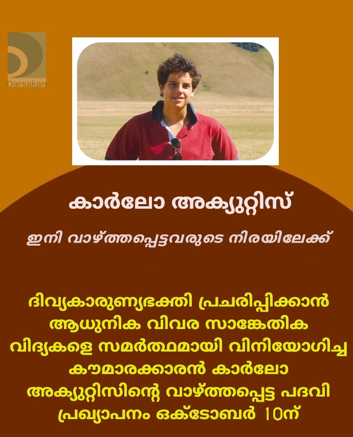 അസീസി: ദിവ്യകാരുണ്യഭക്തി പ്രചരിപ്പിക്കാൻ ആധുനിക വിവര സാങ്കേതിക വിദ്യകളെ സമർത്ഥമായി വിനിയോഗിച്ച കൗമാരക്കാരൻ കാർലോ അക്യുറ്റിസിന്റെ വാഴ്ത്തപ്പെട്ട പദവി പ്രഖ്യാപനം അവിസ്മരണീയമാക്കാൻ ഒരുങ്ങി ഇറ്റലിയിലെ അസീസി നഗരം. സെന്റ് ഫ്രാൻസിസ് അസീസിയുടെ നാമധേയത്തിലുള്ള ബസിലിക്കയിൽ ഒക്ടോബർ 10 വൈകിട്ട് 4.30നാണ് പ്രഖ്യാപന തിരുക്കർമങ്ങൾ. അതോടനുബന്ധിച്ച് ഒക്ടോബർ ഒന്നിന് ആരംഭിക്കുന്ന 17 ദിന ആഘോഷപരിപാടികളാണ് അസീസിയിൽ ക്രമീകരിച്ചിരിക്കുന്നത്.