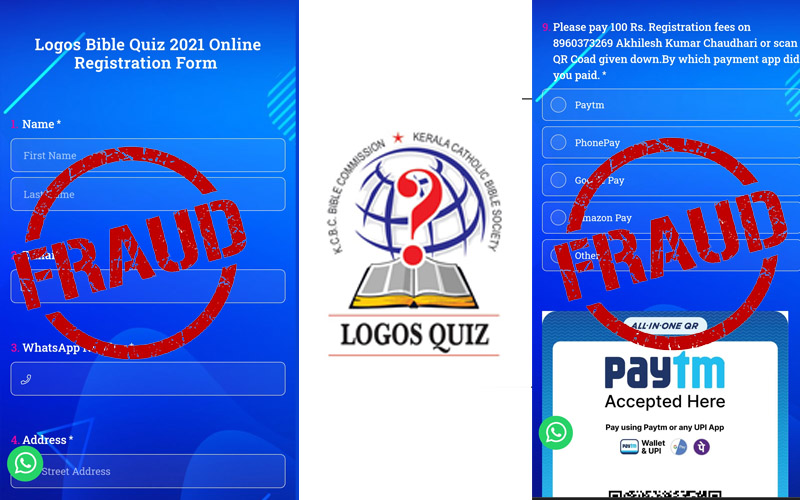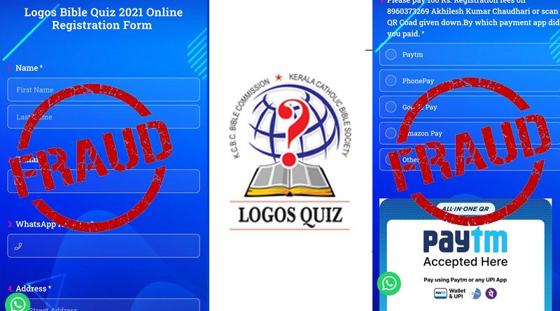 കൊച്ചി: കേരള കാത്തലിക്ക് ബൈബിൾ സൊസൈറ്റി സംഘടിപ്പിക്കുന്ന ലോഗോസ് പരീക്ഷയുടെ പേര് പറഞ്ഞു സാമ്പത്തിക തട്ടിപ്പ്. ലോഗോസ് 2021 പരീക്ഷയ്ക്ക് Online ആയി രജിസ്റ്റർ ചെയ്യാനും 100 രൂപ ഫീസ് അടയ്ക്കാനുമായി ആവശ്യപ്പെട്ടുകൊണ്ടുള്ള വെബ് ലിങ്കാണ് ഇപ്പോള് പ്രചരിച്ചുക്കൊണ്ടിരിക്കുന്നത്. Akhilesh Kumar Chaudhari എന്നയാളുടെ യുപിഐ ഐഡിയിലേക്ക് ലോഗോസ് രെജിസ്ട്രേഷന് പണം അയക്കുവാന് ലിങ്കില് ആവശ്യപ്പെടുന്നുണ്ട്.